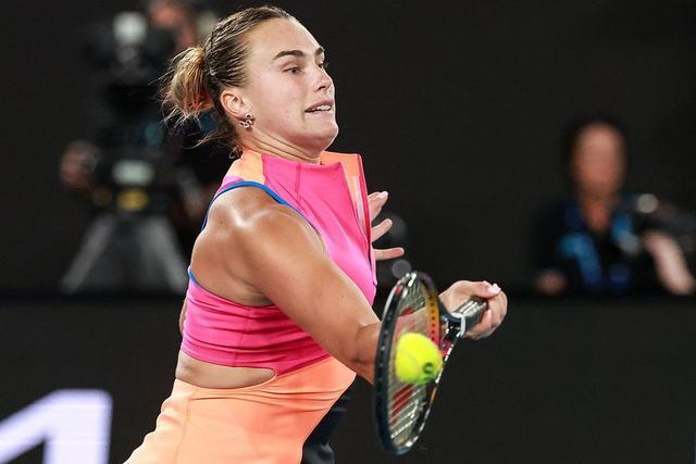 此番对决,从开局到中段都很像是2023年那场澳网女单决赛的翻版。莱巴金娜先声夺人,凭借开场的破发,以6比4赢下首盘。第二盘,萨巴伦卡凭借第10局的关键破发,以6比4扳回一盘。